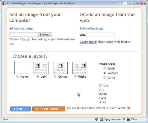 If you choose to do more than one image at a time for upload, the layout choices will apply to all of the images. For example, if you chose "Center" and medium for 3 pictures that you want to upload, you'll get 3 medium sized pictures centered in a row.